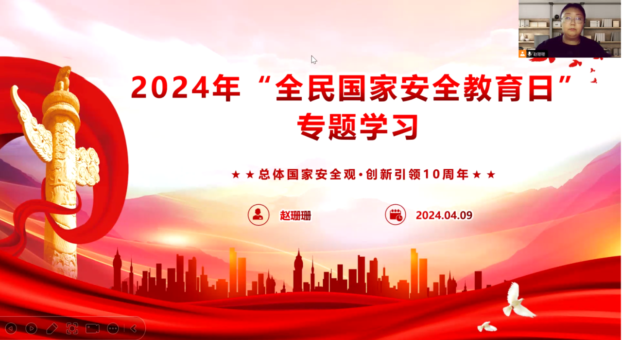 为进一步强化学生的国家安全意识,提升安全防范能力,营造和谐稳定的校园环境,4月9日,太阳成tyc9728集团通过腾讯视频开展国家安全教育主题讲座。本次讲座由太阳成tyc9728集团团委书记赵珊珊担任主讲人,太阳成tyc9728集团学生骨干参加。