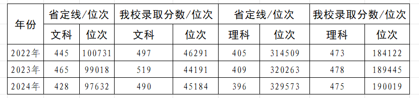 备注:位次数据为我校普通类本科专业录取最低分位次(不含中外合作办学、软件工程、广播电视编导及护理学单列专业)。另外,2024年广播电视编导专业在普通批次招生,文科录取分数线为429,位次96702。考生可以结合自己的成绩和位次,参考这些数据,合理填报志愿。
