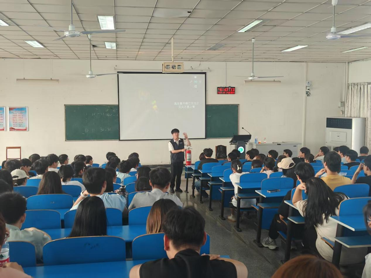 活动第二阶段在2406教室开展,面向全体学生开展消防安全科普与应急演练。张教员以近年来高校宿舍、实验室火灾警示案例为切入点,结合学生违规使用大功率电器、私拉电线、使用明火等常见隐患,提炼“防烟呛、避高温、快撤离”逃生三原则,并现场演示灭火器“提、拔、握、压”操作步骤,并指导学生进行实操练习,确保人人掌握“灭早灭小”核心技能。
