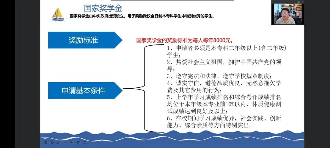 会议伊始,吴英杰老师对本次主题班会的活动流程、背景、目的和要求进行了详细介绍。他详细的讲解了国家助学贷款和生源地贷款申请条件以及申请及审核发放程序,并系统地讲述了学校奖学金的一系列要求。使同学们深刻的了解到国家的资助政策。