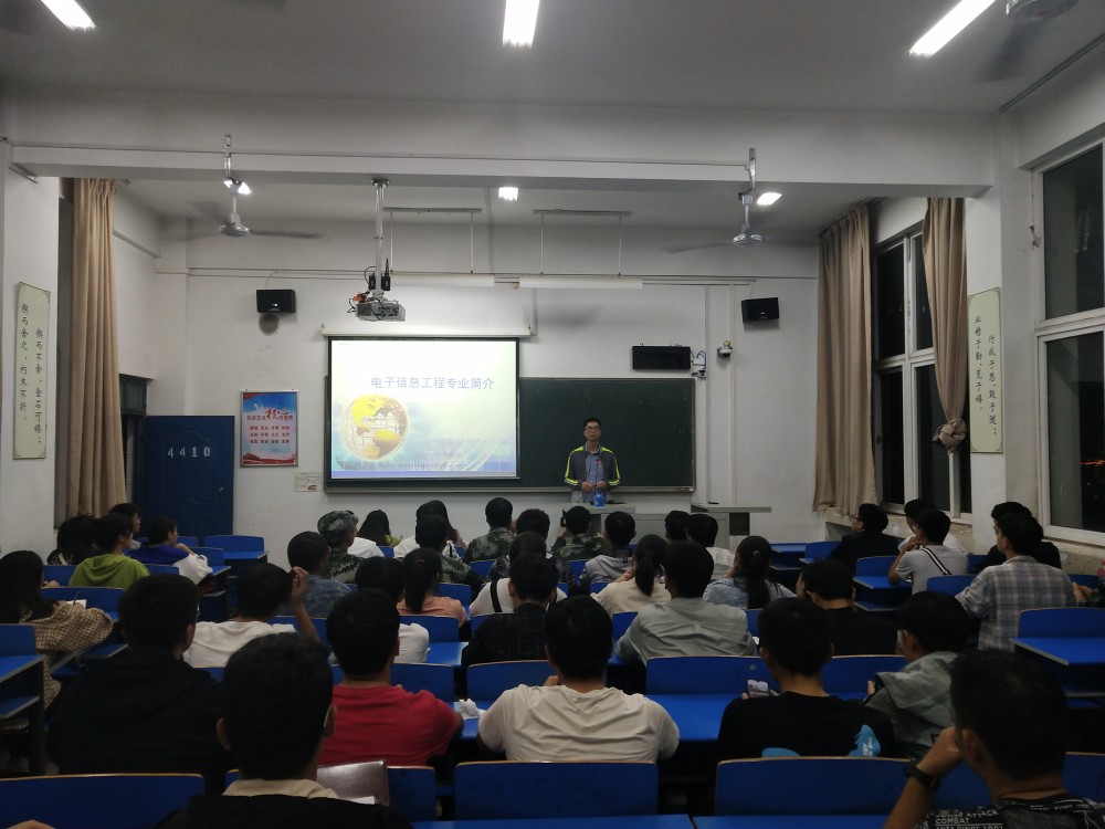 四位老师分别就专业简介、师资队伍、专业背景、课程体系、教学条件、就业面向等做了详细的介绍。王艳辉老师从高考研率、高发展走向方面对电子信息工程专业进行分析,并指导同学们如何去学好这个专业。“要想学好物联网专业,动手实践十分重要,要多去思考并操作,才可以钻透本专业”物联网工程专业王德永老师这样说道。通信工程专业的王军敏老师表示新生进入大学首先要有一个好的规划,学好专业课并不断充实自己。王冠老师向同学们说明了电子信息工程和中外合作办学的区别,并详细讲解了中外合办所具有的西班牙语特色课程,让同学们对大学的学习和生活充满了动力,对未来的工作和发展前景满怀信心。