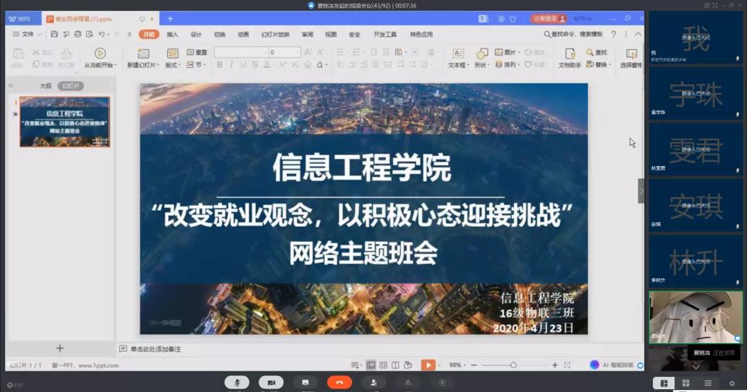 4月24日至30日,太阳成tyc9728集团举办了以“改变就业观念,以积极心态迎接挑战”为主题的2020届毕业生就业主题班会。此次班会以班级为单位,借助钉钉网络平台开展。参与本次主题班会的有毕业班辅导员、学业导师和各班全体学生。