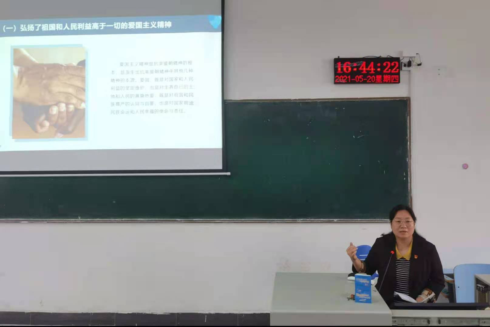 课程开始,王向前向同学们简述了中国人民志愿军抗美援朝的历史背景以及本次课的主要内容。接着,王向前向同学们具体介绍了抗美援朝精神的丰富内涵、历史意义以及时代价值,通过介绍杨根思、黄继光等人的光荣事例,倡导同学们积极继承和弘扬抗美援朝精神,激发同学们对中国人民志愿军的崇敬之情。课堂最后,王向前为同学们留下了两个思考题,让同学们带着问题走进生活,深度挖掘抗美援朝精神从而更好地进行传承。
