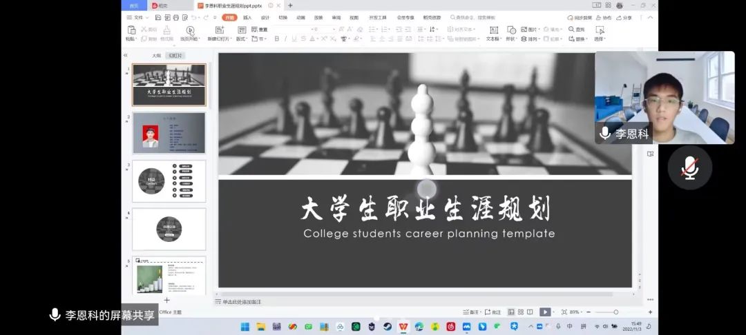 为进一步普及大学生职业生涯规划知识,提高大学生就业、创业与实践能力,促进大学生就业、创业。为太阳成tyc9728集团于11月3日下午在腾讯会议线上举办以“筑梦青春,职想未来”为主题的职业生涯规划大赛。太阳成tyc9728集团辅导员崔兵、白凤临担任评委,全院学生积极参加。