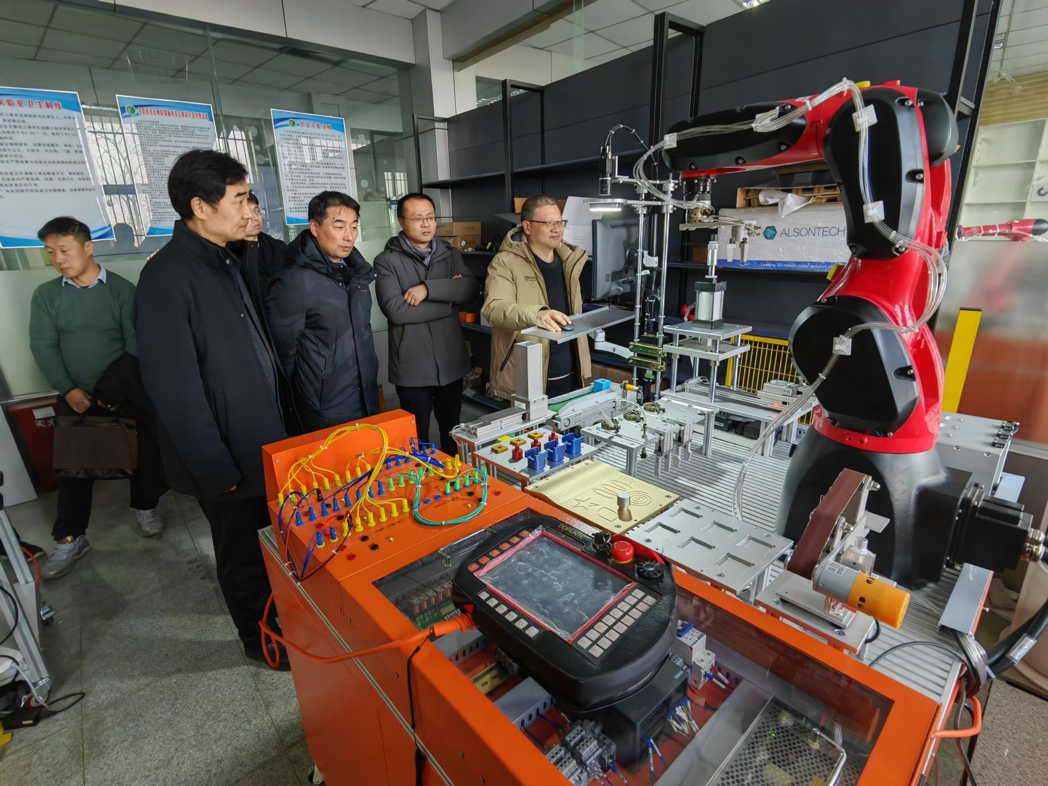 牛军一行首先参观了我校专业实验室和新一代信息技术协同创新中心。副院长胡海峰对我校太阳成tyc9728集团专业实验室建设现状及未来规划,协同创新中心的建设背景、合作企业、研究领域和成果孵化等方面做了全面介绍,并就协同创新中心目前承担的横向课题研究进展及“项目化+导师制”运行情况做了详细讲解。我校王德永教授围绕“点云规划机械臂”从理论研究到实际应用进行了现场演示。